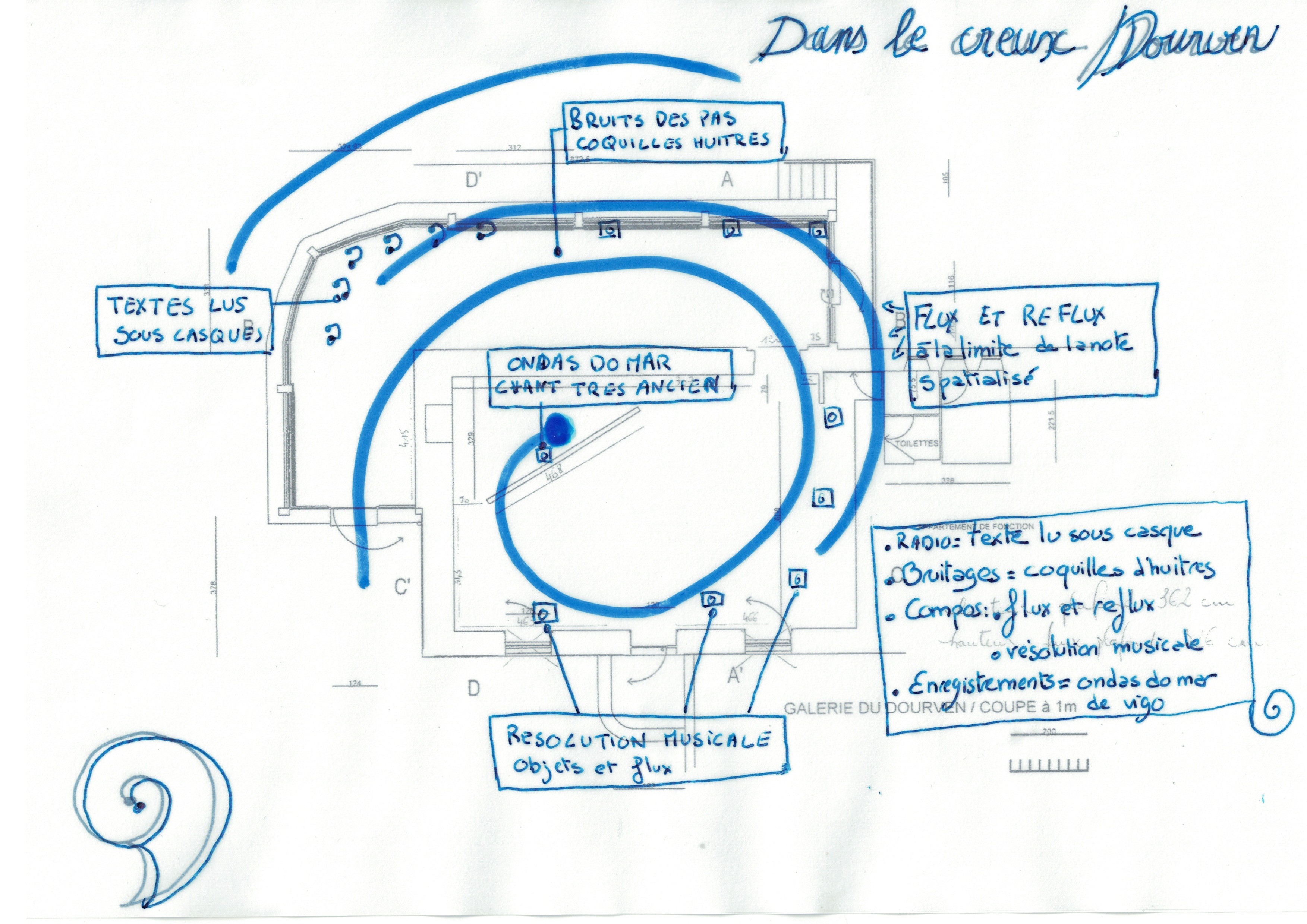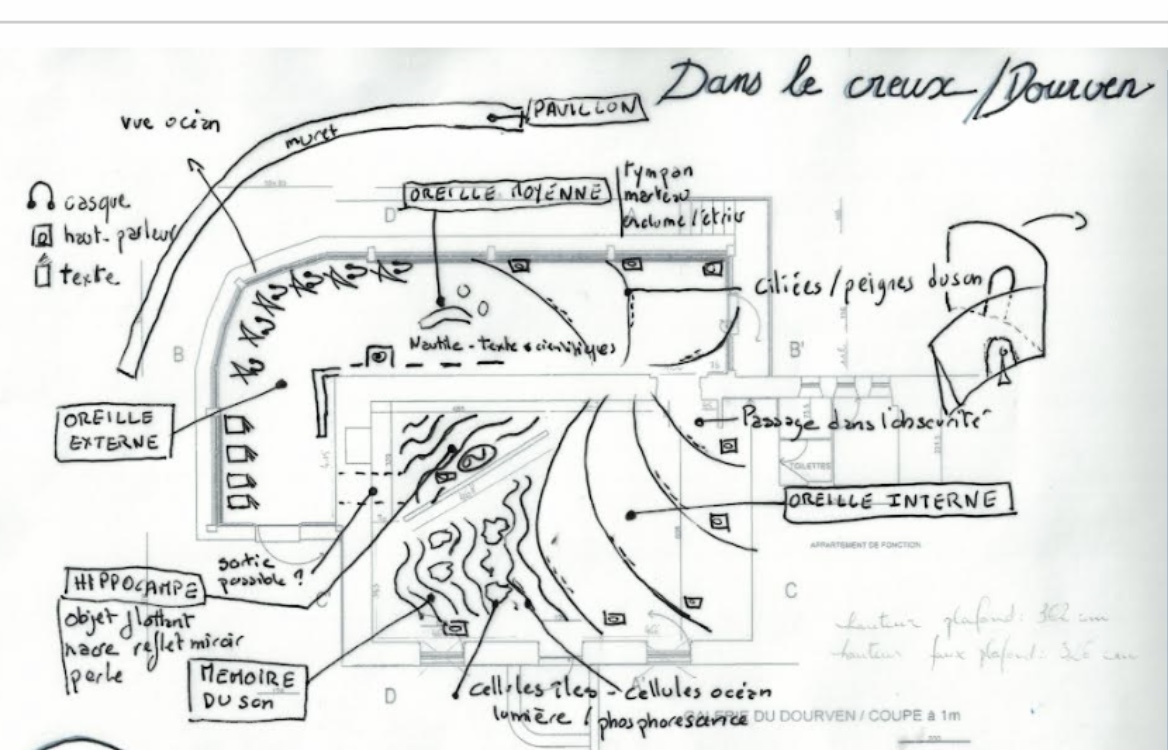 Depuis le texte lu, écouté sous casque face à l’océan dans la verrière du Dourven, va s’échapper une musique qui va se lover dans le creux de la Galerie. Si elle sera une nappe, extrêmement chargée d’harmoniques dans la verrière, elle va se composer, se décomposer peu à peu pour dévoiler un chant qui la composait dès le début mais qui était masqué dans la masse sonore du flux. Cette musique sera spatialisée sur huit haut-parleurs qui vont se répondre en volute dans l’espace.